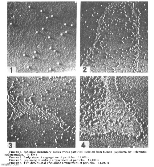The search for an answer to this question led me to a 1949 paper by Maurice Strauss, Henry Bunting, and Joseph Melnick. What the researchers did was collect warts from the hands and feet of children, grind the warts up, mix the resulting tissue crud with aluminum oxide and water, spin the mixture really fast for a while, and then take the supernatant and shadow cast it in chromium to view the sample under an electron microscope. The researchers then assumed whatever particles seen which resembled a “virus” were in fact one. In this case, the three researchers compared their choosen particles to those which were found in plants and claimed that they had discovered a “virus” as the particles resembled the plant “viruses.” Did Strauss, Bunting, and Melnick actually prove that these particles assumed to be HPV were an actual “virus?” No, as there were no attempts to prove pathogeniticity in the paper whatsoever. All the three researchers did was point at random particles and declare a “virus,” hence the “virus-like” particles in the title and the summary of the paper. Highlights below: