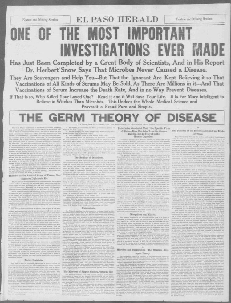 In the spirit of listening to and learning from the past, I am presenting here what I find to be one of the best early refutations of the germ theory of disease. I was alerted to the below 1913 El Paso Herald article by a Twitter user named CharliePoet, and I feel that the article needs to be shared in its entirety. I will summarize and interject commentary along the way while providing pertinent information that I have found matches up exactly with the argument that is made. The headline stated that this is “one of the most important investigations ever made,” and I wholeheartedly agree. Let the germ theory house of cards fall.